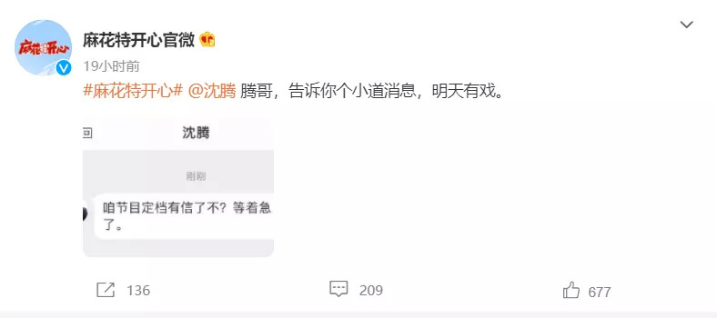 “咱节目定档有信不?等着急了。”去年官宣制作的开心麻花团综,迟迟不见定档消息,就连沈腾、马丽等主创都坐不住了,轮番私信轰炸官微。“哥,告诉你个小道消息,明天有戏。”这一来一回也算是提前把节目效果拉满。