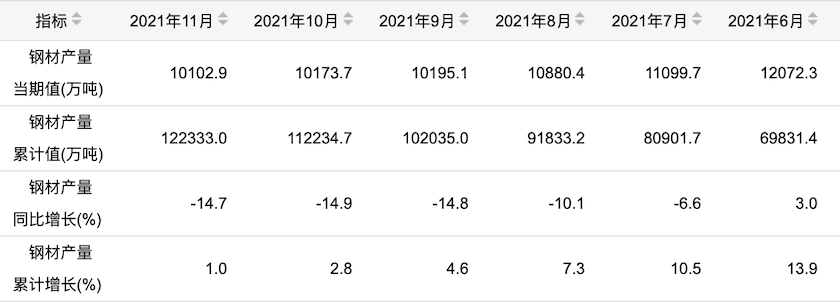 据国家统计局数据,1-11月全国粗钢产量9.46亿吨,同比下降2.6%;全国生铁产量7.96亿吨,同比下降4.2%;全国钢筋产量2.32亿吨,同比下降4.1%。2021年7月以来,全国钢材减产趋势明显,月产量较去年同期水平大幅下降。2021年9月至11月,全国钢材月产量同比下降均达到14%以上。