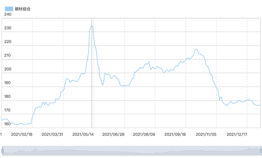 从全行业来看,2021年全国钢铁价格也呈现先扬后抑的倒V型走势。根据上海钢联,2021年全国钢材综合价格指数在5月迎来高点,10月后开始下行,但仍高于去年同期水平。