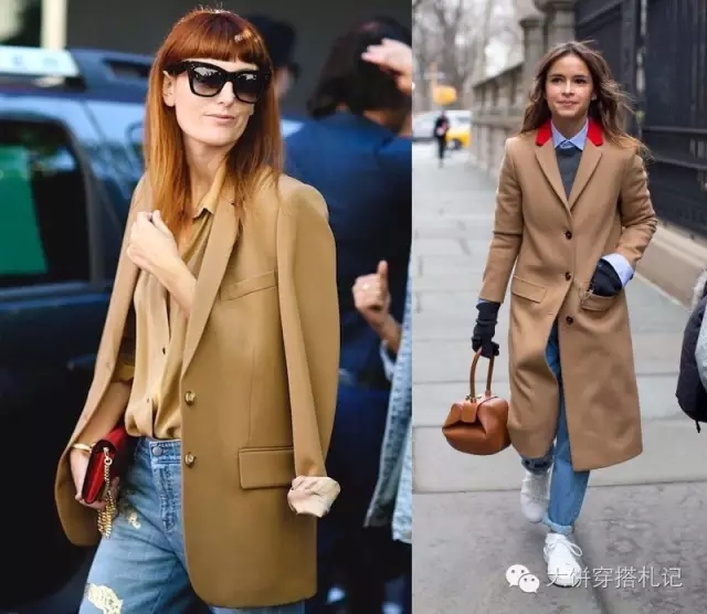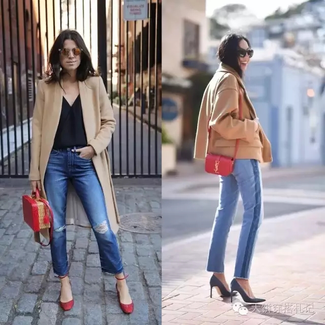 继续举例,驼色系和denim做了搭配之后,用一点点的红色/橙色做提亮,也一样透着高级感。▼