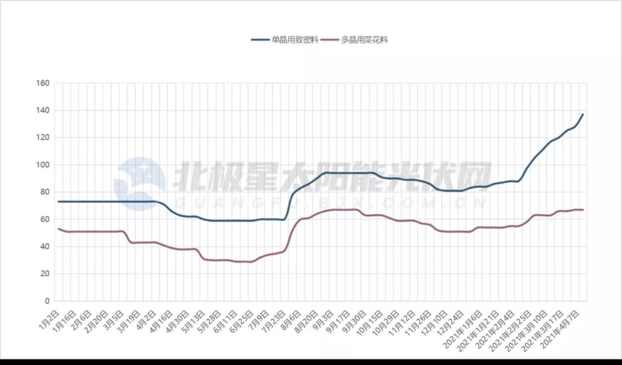 那便是作为产业上游的硅料价格上涨较快,价格从年初85元/KG上涨到140元/KG。