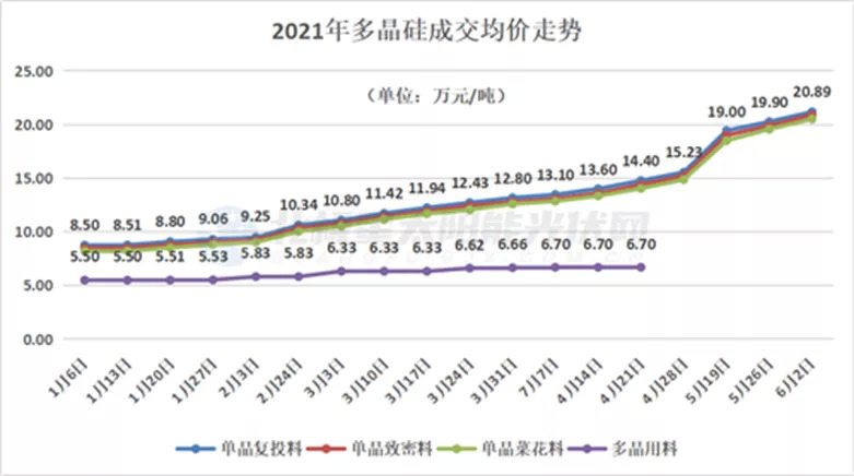 进入2021年二季度,硅料价格持续攀升,到5月中旬,市场缺硅现象进一步加剧,业内人士称部分企业甚至个人囤货待沽,很多企业已经拿不到多晶硅料了。