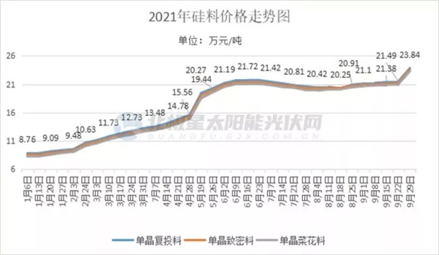 其结果可想而知,解决稀缺性最好的办法就是涨价,拿不到原材料的小企业疯狂加价,这便有了硅料价格突然的快速拉升。价格从年初的8.5万/吨上涨到21万/吨,涨幅147%。