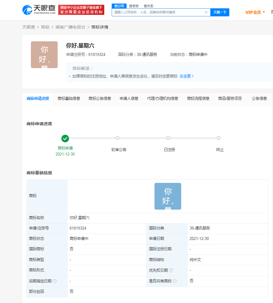 据天眼查App显示,近日,湖南广播电视台申请注册“你好,星期六”商标,国际分类为通讯服务,当前商标状态为申请中。