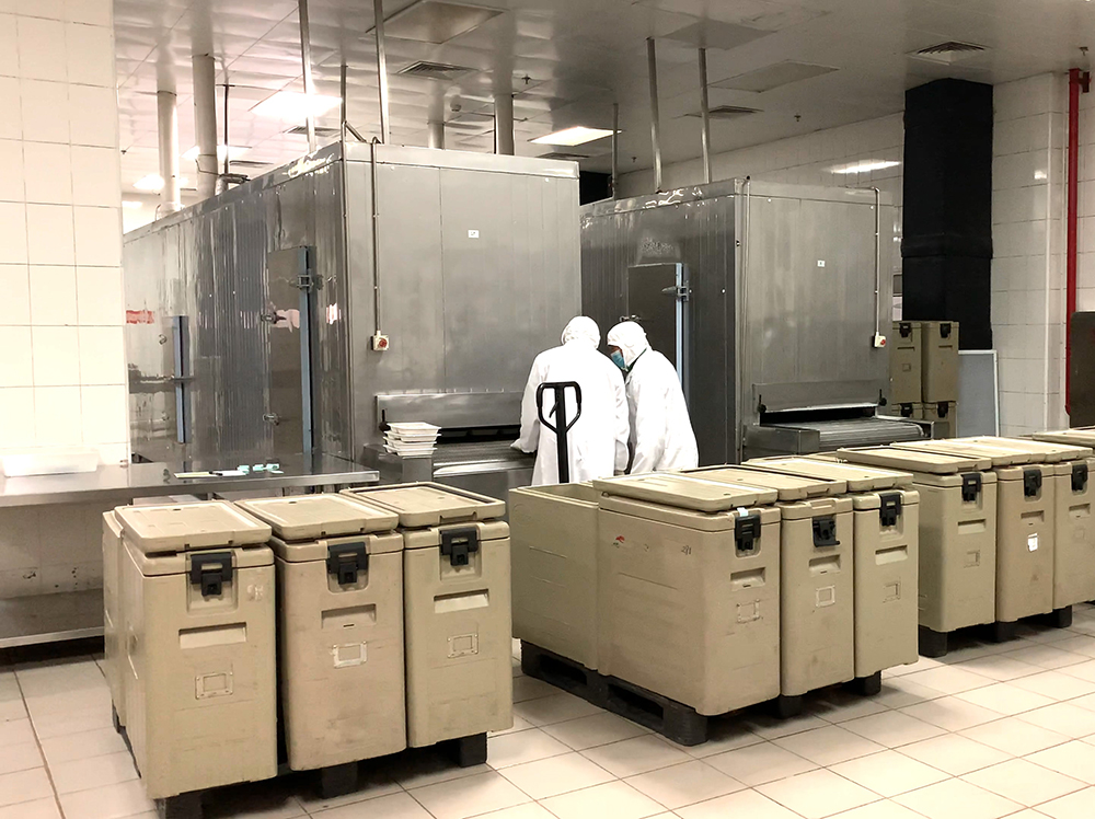 高铁盒饭的生产流程是怎样的?印象川之味生产部副部长张果告诉界面新闻,食材供应商都是通过公开招标选定的,每天确定生产量后,在工厂生产饭菜后包装入盒,再通过速冷隧道快速冷却至0-5℃。