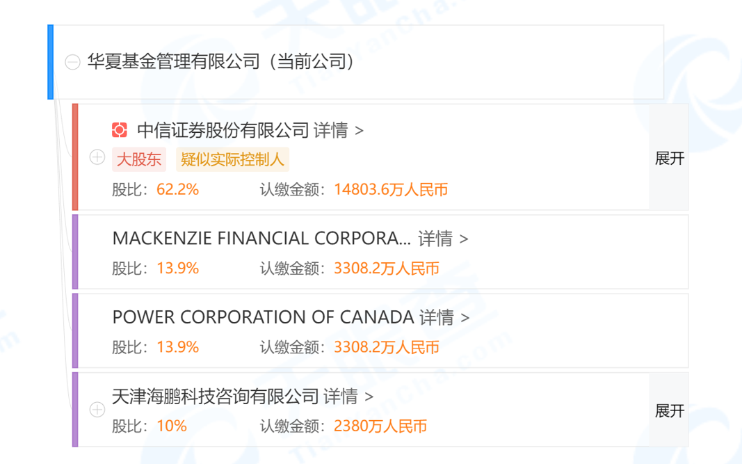 天眼查数据显示,若此项收购获证监会批准,华夏基金的股权结构将变为中信证券持股62.2%、万信投资持股27.8%、天津海鹏科技持股10%。