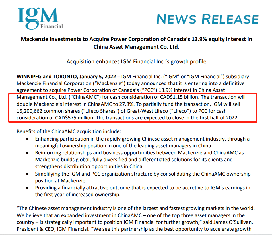 值得注意的是, IGM的母公司就是加拿大鲍尔集团(PowerCorporation of Canada),也就是说, 此次股权转让,转让方和受让方存在控股关系。