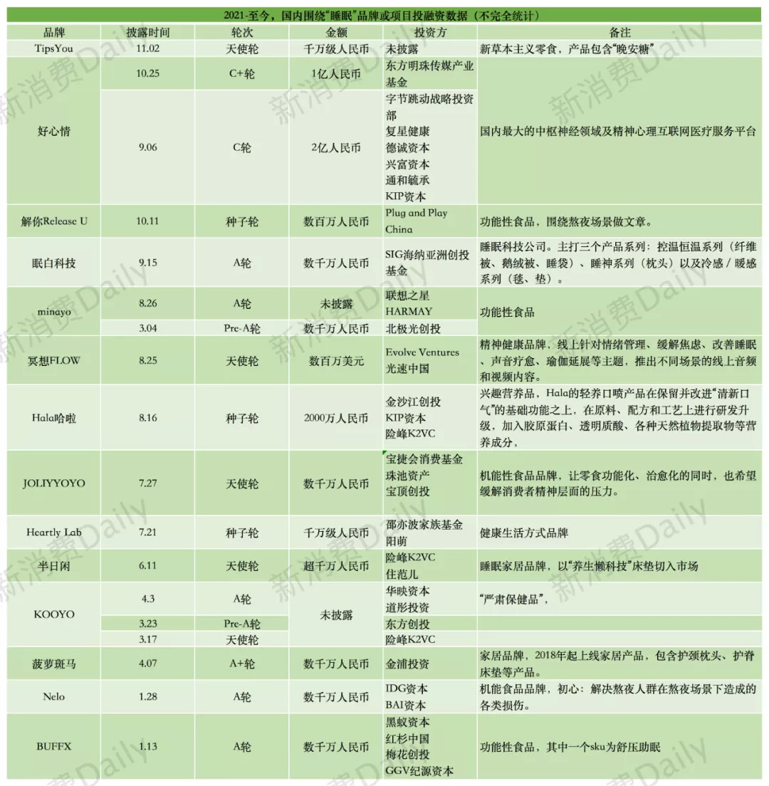 事实上,正是在失眠大军和朋克养生群体的支持下,越来越多的围绕“睡眠”的项目也开始受到资本青睐。