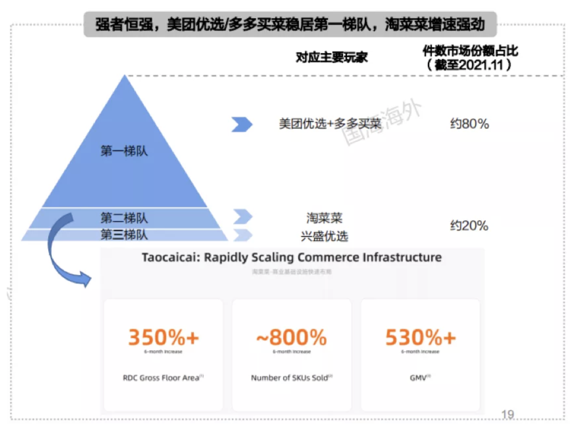 据国海证券的研报显示,后入局的多多买菜、美团优选位列第一梯队,淘菜菜处于第二梯队,兴盛优选和其他区域性品牌排在其后。