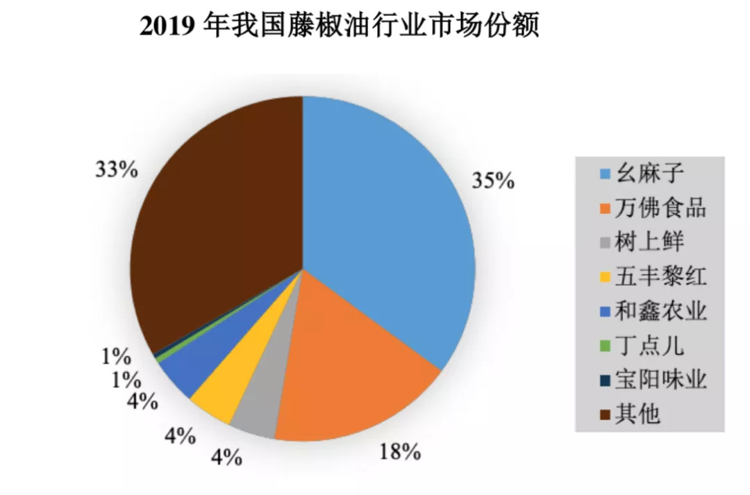 根据和君咨询的调研数据,2019年幺麻子在藤椒油市场中的占有率约为35%,是国内最大的藤椒油及相关复合调味品的生产厂商之一。
