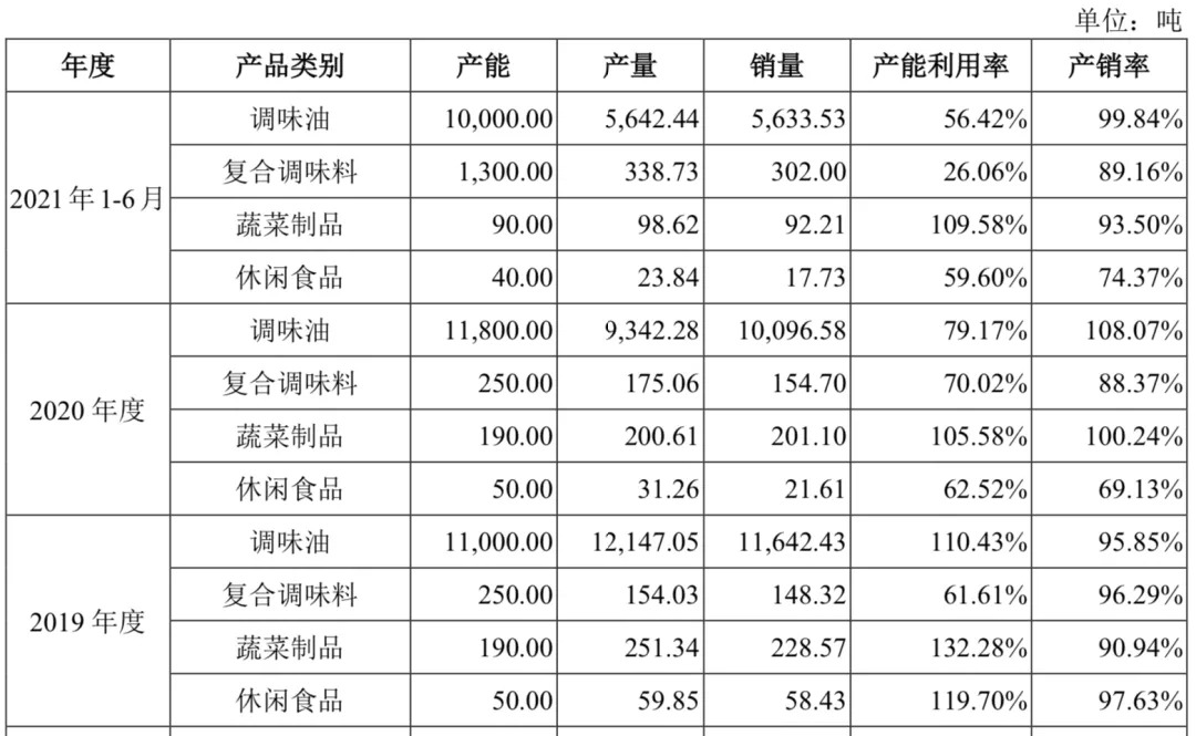 当前的新品研发不足,已经给幺麻子带来了第二大风险,单一品类产能过剩。招股书显示,2018年-2021年上半年,调味油品类的产能利用率分别为87.36%、110.43%、79.17%、56.42%。可以看到,自2020年起,其调味油产能利用率显著下滑,2021年上半年,过剩产能接近一半。