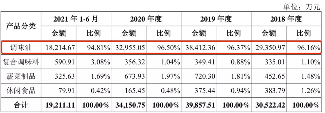 幺麻子最被外界担心的问题是支柱型品类太过单一。幺麻子十分依赖调味油,2018年-2021年上半年,该品类收入贡献比例均在9成以上,分别为96.16%、96.37%、96.5%、94.81%,而调味油品类中又以藤椒油为核心,在报告期内销售占比分别为89.24%、89.29%、86.73%、83.88%。