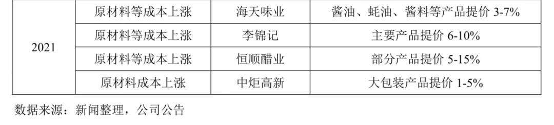 这也是整个行业遇到的问题,由于原材料等成本上涨,2021年第四季度,从海天味业开始,调味品生产企业纷纷宣布产品提价。调味品企业上调价格,毛利率最先受到影响。