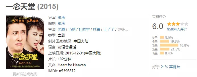 就在这年底,沈腾和马丽主演的另一部电影《一念天堂》登陆元旦档期,这部电影的拍摄在《夏洛特烦恼》之前,出品方也和开心麻花并无关系。