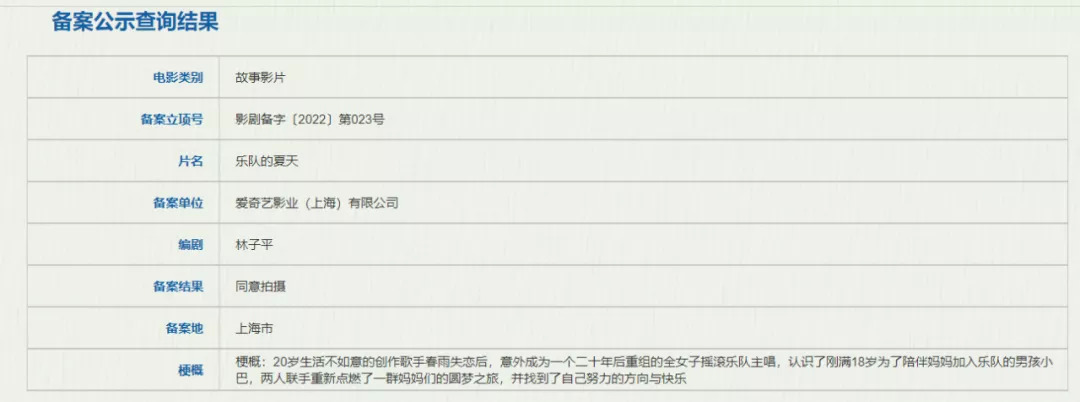 1月5日,据国家电影局公布的2021年11月全国电影剧本(梗概)备案、立项公示,电影版《乐队的夏天》正式立项,编剧为林子平,备案单位是爱奇艺影业。