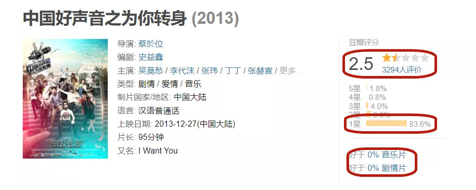 4年后,现象级综艺《中国好声音》同样为人气选手量身定制了故事片《中国好声音之为你转身》,影片投资3000万,拍摄周期仅为20多天,可惜也没有吃到粉丝经济的红利。电影最终票房仅为62万,豆瓣评分更是惨不忍睹,仅为2.5分,其中83.6%的观众打出了1星。