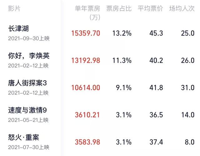 相较于2020年,刚过去的2021年年度票房整体复苏,全年累计实现票房470.3亿元,同比上升231.6%。但就票房排名来看,榜首《长津湖》一部就占有57.72亿,位于第二名《你好,李焕英》又瓜分走54.13亿,仅这两部电影的票房就占全年总票房的23.8%,剩下的738部分剩下的358亿,竞争非常残酷。