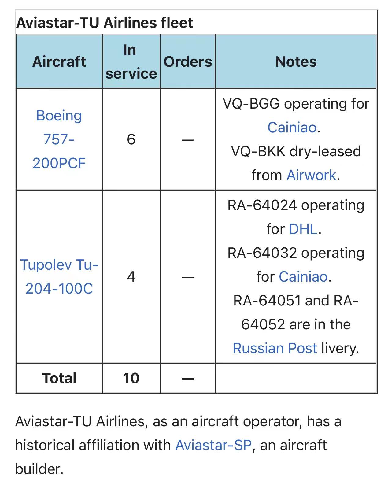 俄罗斯航星航空(Aviastar-TU)成立于2000年,是一家货运包机航空公司,其总部位于俄罗斯莫斯科,机队规模为10架,包括6架波音757-200和4架图-204。