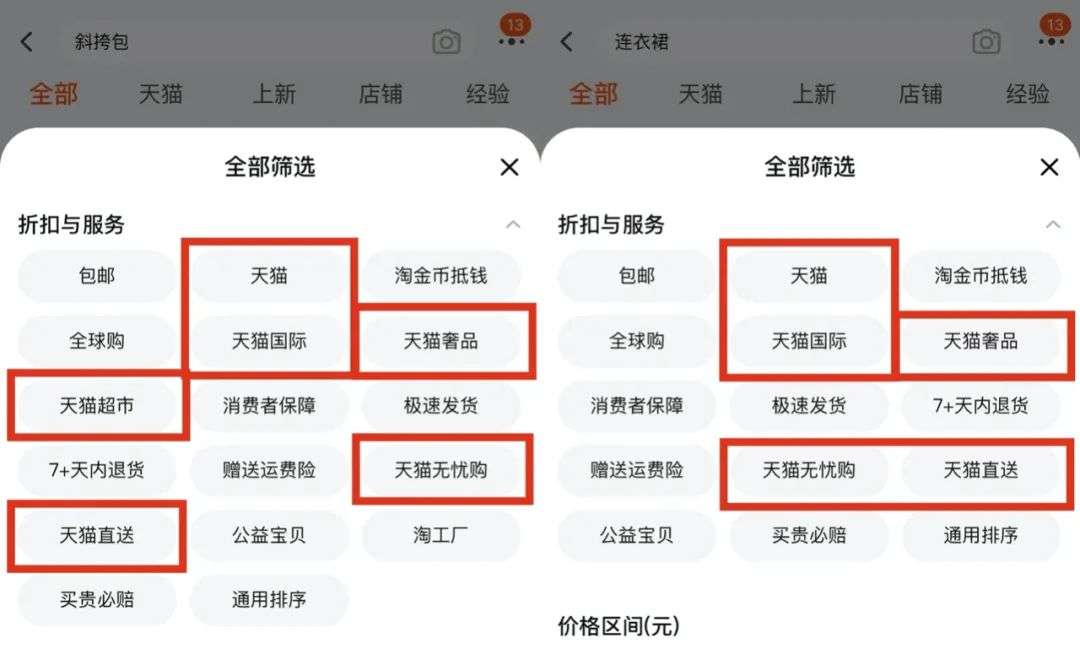在淘宝的搜索页的筛选项中,天猫的存在感也十分强,天猫、天猫国际、天猫超市、天猫奢品、天猫无忧购、天猫直送等天猫业务筛选项赫然在列,天猫筛选项的数量平均能够占到所有筛选项的三分之一左右。