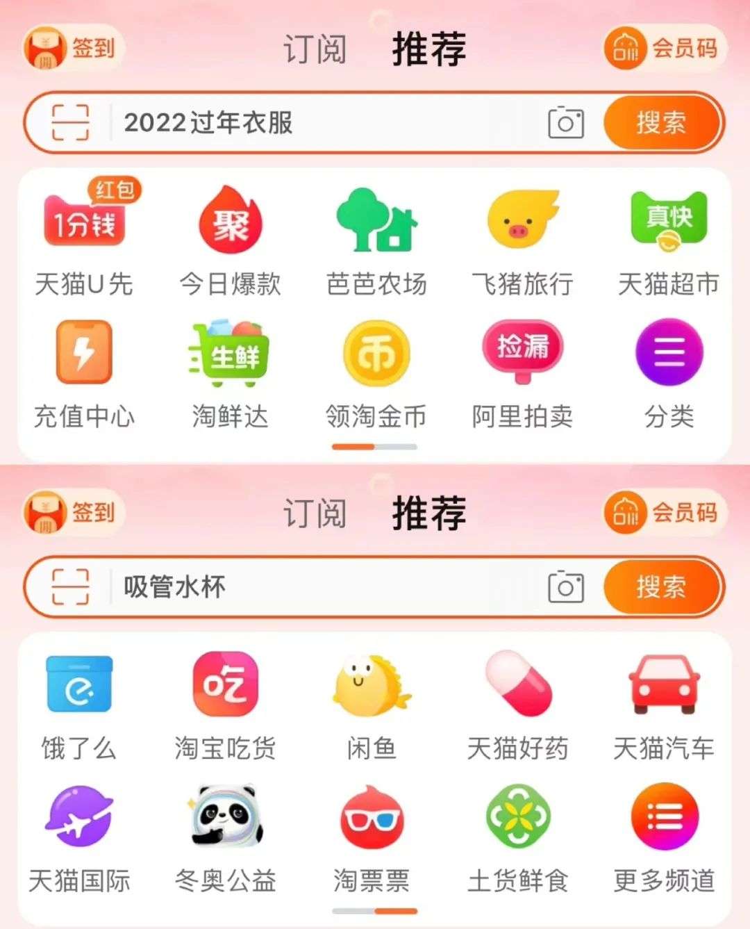 除了自然流量的加持,淘宝内还有众多天猫的业务入口。例如目前手机淘宝首页导航栏的第一位,为“天猫U先”,此外,天猫超市、天猫好药、天猫汽车、天猫国际几大业务的入口也在首页导航栏内。