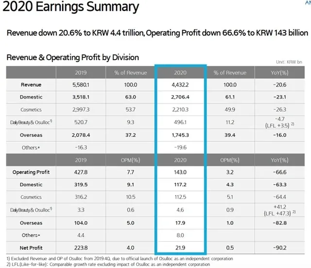 爱茉莉太平洋财报显示,悦诗风吟全球销售额从2017年的6420亿韩元减少到2020年的3486亿韩元,营业利润从2017年的1079亿韩元减少到2020年的70亿韩元(1亿韩元约为58万人民币)。