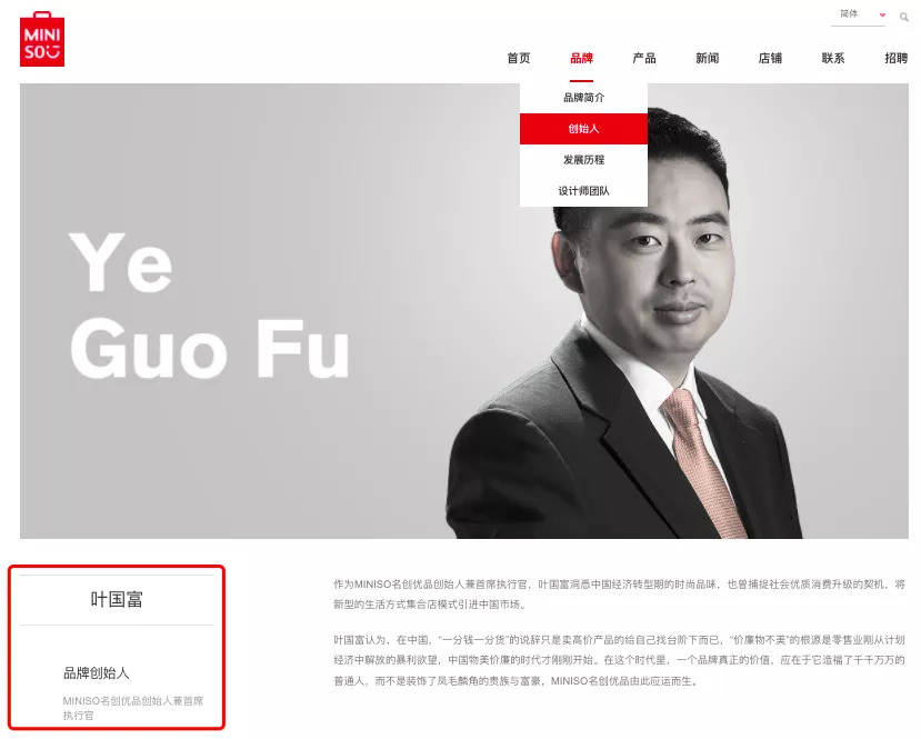 2020年9月,名创优品中文版官网界面(百度快照)显示,名创优品是由中国青年企业家叶国富先生于2013年开始经营,中国总部位于广东省广州市。