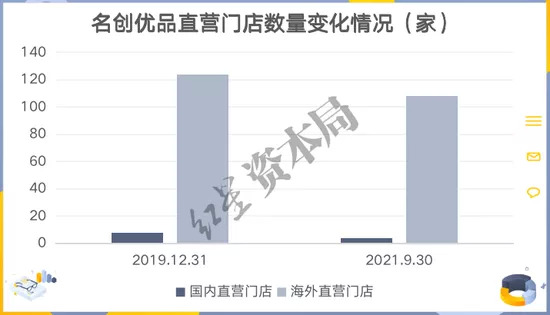 值得一提的是,门店总数在增加的同时,直营店数量却不断减少。截至2019年末,名创优品在国内的2543家门店中,直营门店数量为8家;而截至2021年三季度末,国内总门店数量增至3031家,直营店仅剩下4家。