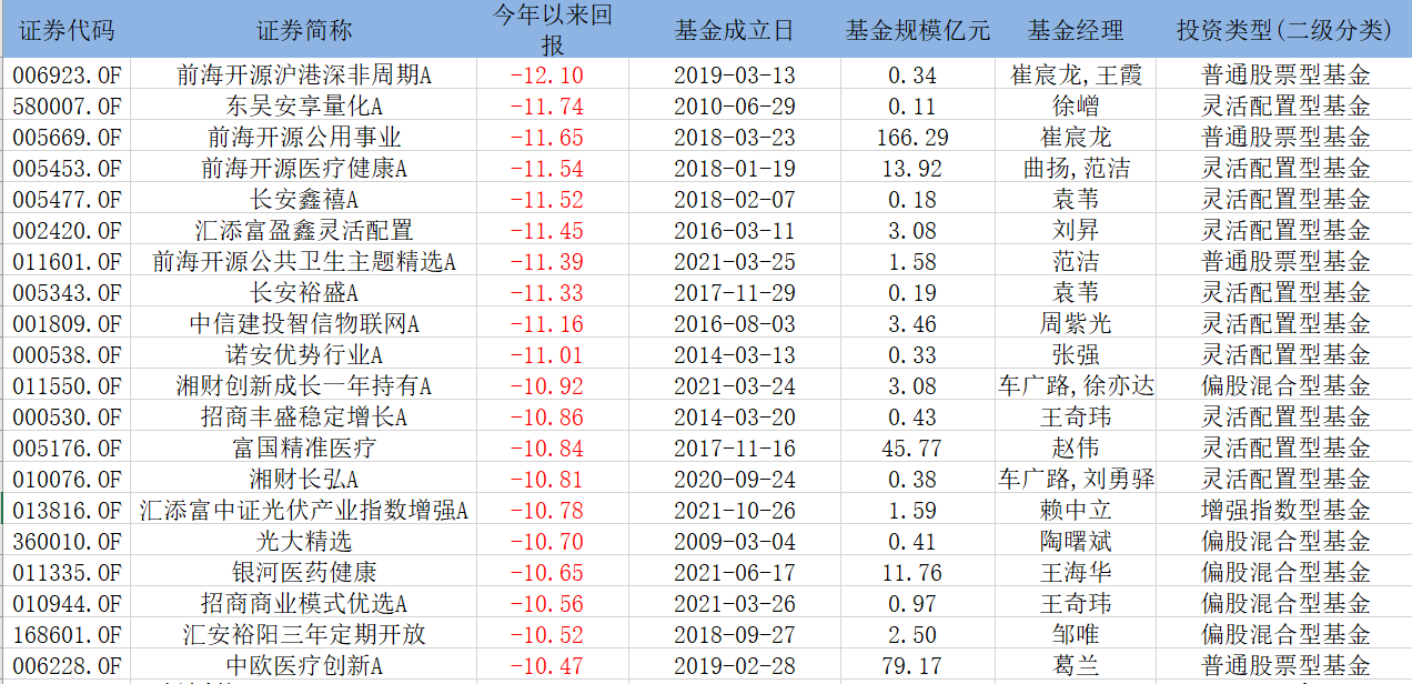 Wind数据显示,本周以来,有49只基金跌幅在10%以上。在跌幅前20位的基金中,崔宸龙管理的前海开源沪港深非周期、公共事业两只基金均在倒数前三的位置;曲扬、范洁管理的前海开源医疗健康、范洁管理的前海开源公共卫生主题精选跌幅均超过11%;葛兰管理的中欧医疗创新跌幅为10.47%。