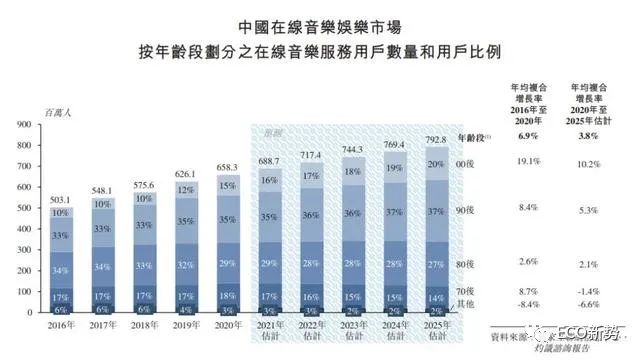 数据显示,中国在线音乐娱乐平台市场规模自2016 年的 67 亿元增至 2020 年414 亿元,年均复合增长率达到 57.9%,预期 2025 年将达到1670 亿元。高增速背后,离不开90后、00后用户的“用爱发电”:截至到2020年,1990年或之后出生的用户,占整个中国在线音乐娱乐市场用户的50%,且该年龄段用户规模的增长速度高于其他年龄段。除消费优质音乐及音乐衍生内容外,这些年轻用户在音乐社交、个性表达方面也有更高需求,也愿意为这些需求买单。