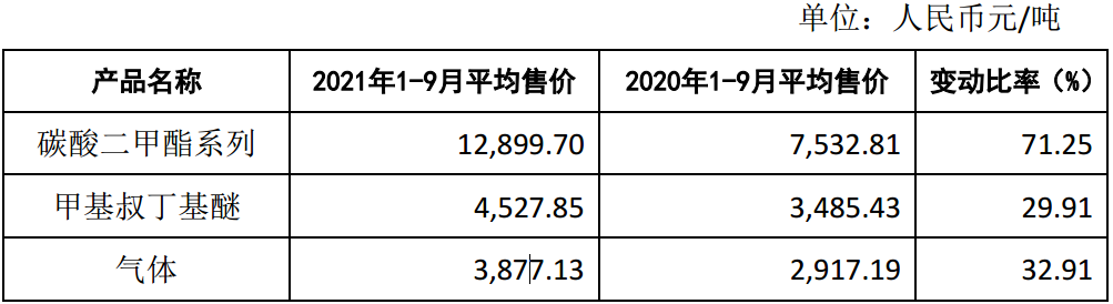 该公司去年10月底披露2021年前三季度主要经营数据公告显示,旗下三大产品均明显涨价。具体看来,2021年1-9月,石大胜华旗下碳酸二甲酯系列产品平均售价12,899.7元/吨,较上年同期的7532.81元/吨增长71.25%;旗下甲基叔丁基醚产品平均售价4527.85元/吨,较2020年同期平均售价3485.43元/吨增长29.91%;此外,旗下气体类产品平均售价是3877.13元/吨,较上年同期的2917.19元/吨同比增长32.91%。