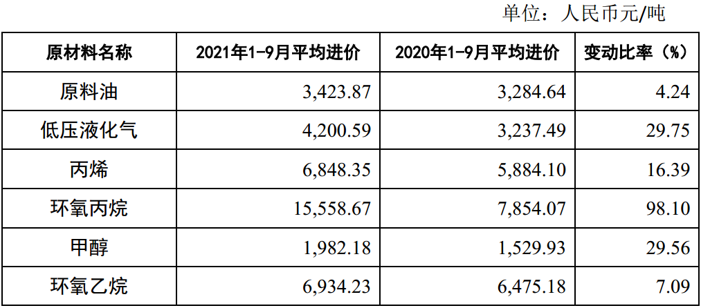 不过,石大胜华所需的原材料价格也涨势显著。据其披露,2021年前9月,环氧丙烷的平均进价从2020年同期的7854.07元/吨增至15558.67元/吨,同比增幅98.1%;低压液化气的平均进价也从上年同期的3237.49元/吨增至4200.59元/吨,同比增幅29.75%;甲醇的平均进价也从上年同期的1529.93元/吨升至1982.18元/吨,同比增幅29.56%。
