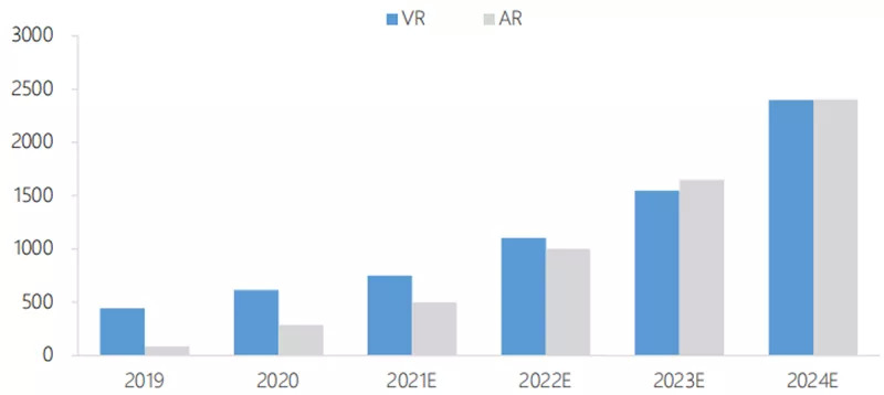 ▲2019-2024E全球VR/AR市场规模预测(亿元)