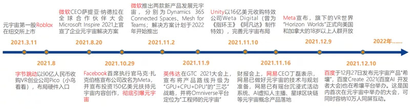 另一个重要原因是Facebook改名Meta,以此为基点,全球科技巨头跑步入场元宇宙。无论是Meta这类从移动互联网开始崛起的新势力玩家,或是微软这种从互联网开始就参与其中、历经产业多轮更迭的老牌玩家,均在抢占“元宇宙”的先机。我们需密切跟踪海内外科技公司的元宇宙布局动向,一方面能够动态评估各科技公司的未来潜力,另一方面也能够持续感知元宇宙的成熟程度。