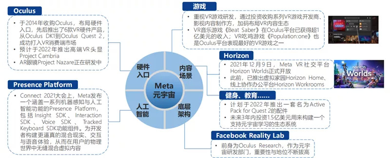 基于上述判断,全球范围内,预计巨头们率先在硬件产业链、内容、底层架构上发力,预计2022年硬件、内容、底层架构板块将有较大变化。