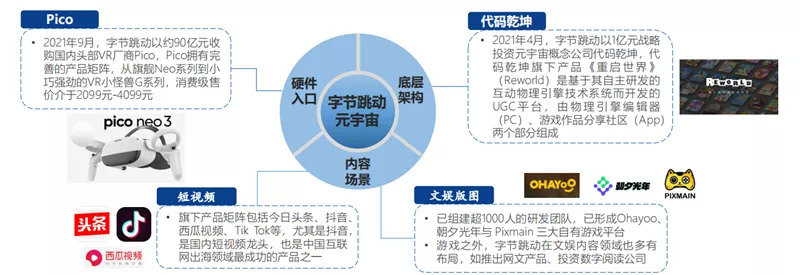字节跳动以社交与娱乐为切入口,基于短视频流量优势在海内外市场同步发力,同时收购头部VR创业公司Pico补足硬件短板。按照我们划分的元宇宙研究框架的六大组件,字节跳动在硬件入口(收购Pico)、底层架构(投资代码乾坤、维境视讯)、内容与场景(短视频、游戏、VR社交)这三大方向上均着力布局。
