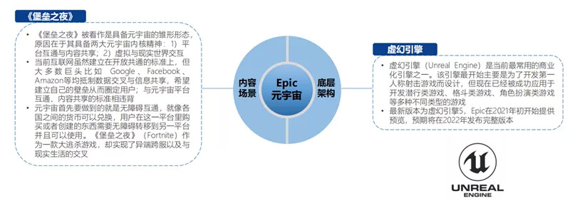 按照元宇宙研究框架的六大组件,Epic Games在内容与场景(《堡垒之夜》)、底层架构(虚幻引擎)两大方向上均着力布局。