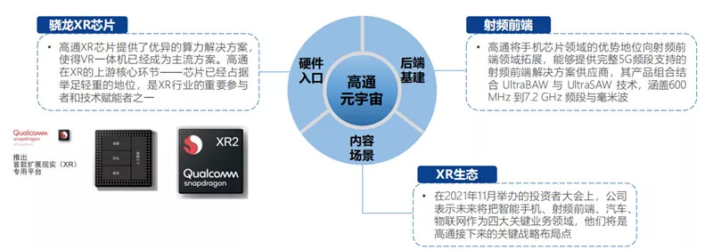 按照元宇宙研究框架的六大组件,目前高通在硬件入口、后端基建、内容与场景这三大方向上均着力布局。