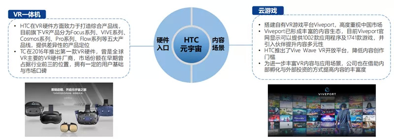 打造五大VR产品线,构建硬件—内容良性闭环。HTC是行业内头部的VR硬件厂商,最早与2015年与Valve合作开发的HTC VIVE头显正式发布,其布局元宇宙的核心优势在于其丰富完善的VR产品矩阵已经占据一定的市场份额与用户心智,背靠VR硬件优势,公司持续加大内容与平台生态建设,形成硬件—内容的良性循环。