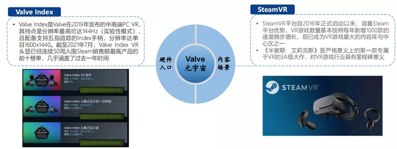 Valve布局元宇宙的优势主要体现在VR硬件、游戏内容以及Steam平台的良好协同。如果将元宇宙划分为消费元宇宙与企业元宇宙,Valve在构建游戏元宇宙的方向上已经初步具备硬件、内容与平台优势——Valve Index在高端VR头显中占据优势、自研《半衰期:艾莉克斯》树立VR游戏标杆之作、Steam是目前全球影响力最大的游戏平台之一。