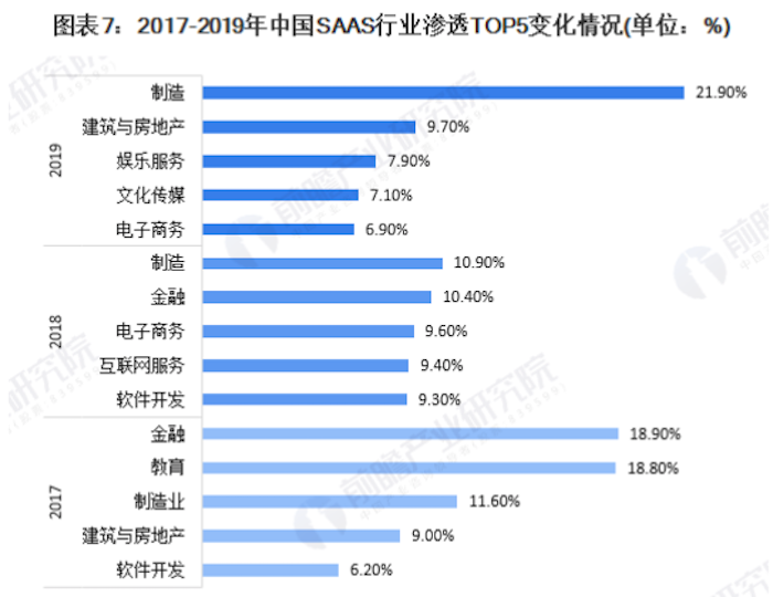 前瞻产业研究院数据显示,2017年至2019年中国SAAS行业渗透TOP5行业集中在制造、金融、教育、电子商务等行业,对于医疗的应用并不多。