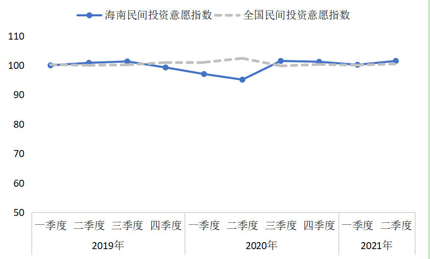 民间投资意愿指数显示,海南民间投资意愿总体呈“V”形趋势,疫情后恢复迅速,从2020年三季度开始到2021年二季度,海南民间投资意愿迅速反弹。2019年以来,在超七成时间里,民间投资意愿指数高于全国或与全国持平。