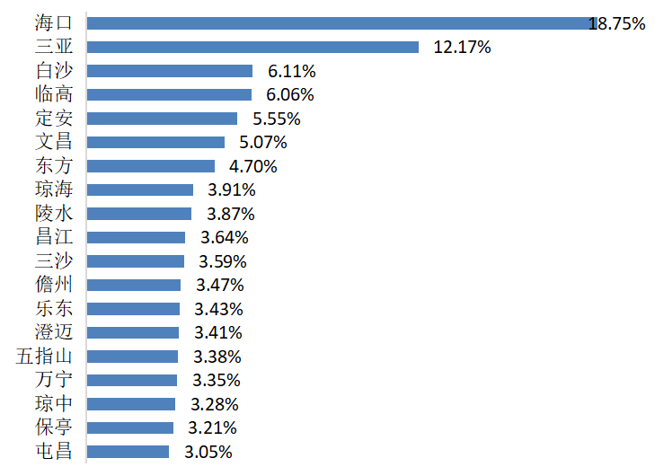 参与度指数显示,民间投资前五大地区为:海口、三亚、白沙、临高、定安,分别占比18.75%、12.17%、6.11%、6.06%和5.55%。