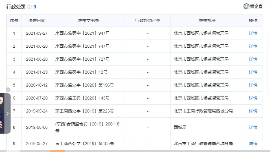 爱企查显示,2019年5月至今,寺库已经有9起被北京市西城区市场监督管理局等部门进行的处罚,被罚原因包括违反《中华人民共和国产品质量法》《中华人民共和国电子商务法》《中华人民共和国广告法》等各项法规相关规定。