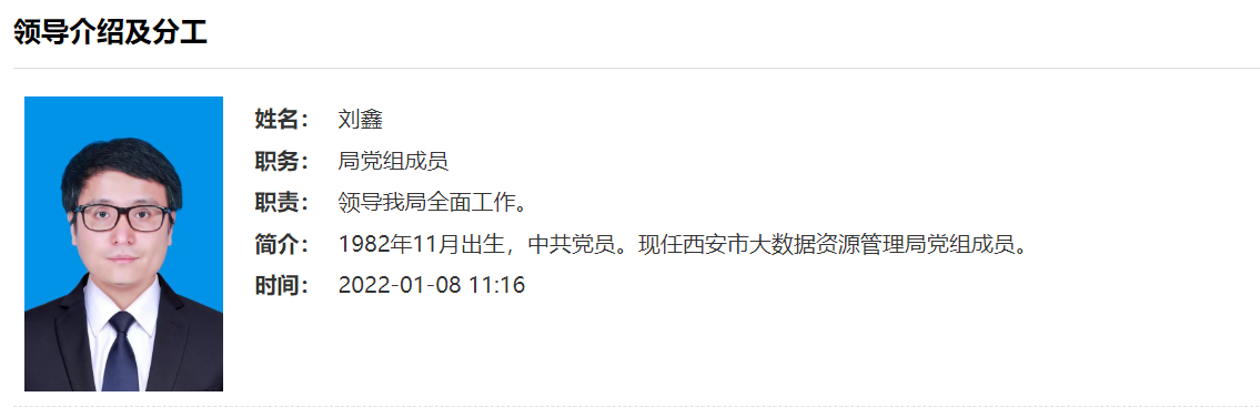 1月8日,西安市大数据资源管理局官网更新消息显示,刘鑫,1982年11月出生,中共党员,领导西安市大数据资源管理局全面工作。