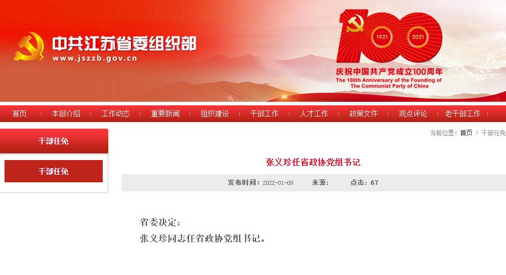 据中共江苏省委组织部1月9日消息,省委决定:张义珍同志任省政协党组书记。