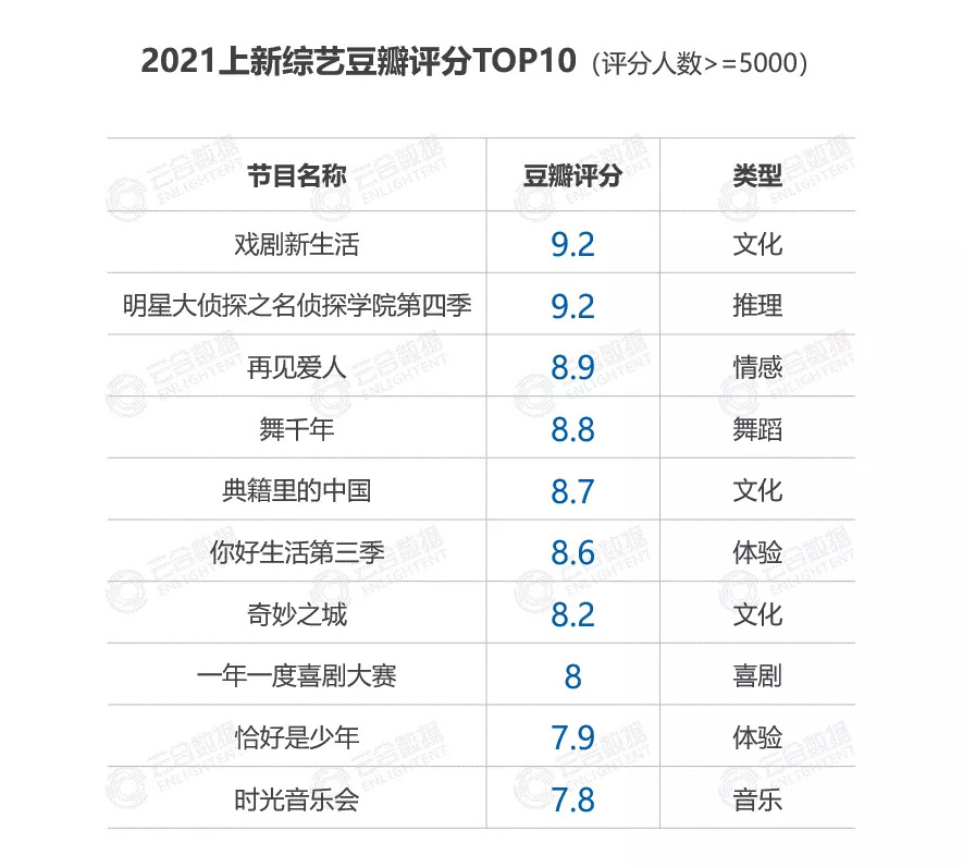 2021年的综艺市场,正行至新的拐点,类型题材的洗牌、平台布局的探索、制作公司的转型与摸索,都很难简单用短期效应来粗暴论定,但无可否认的是,这会是一种良性的前进,也为2022年的综艺争霸赛留下了新的谜题。综艺赛道,正在进入新的纪元。
