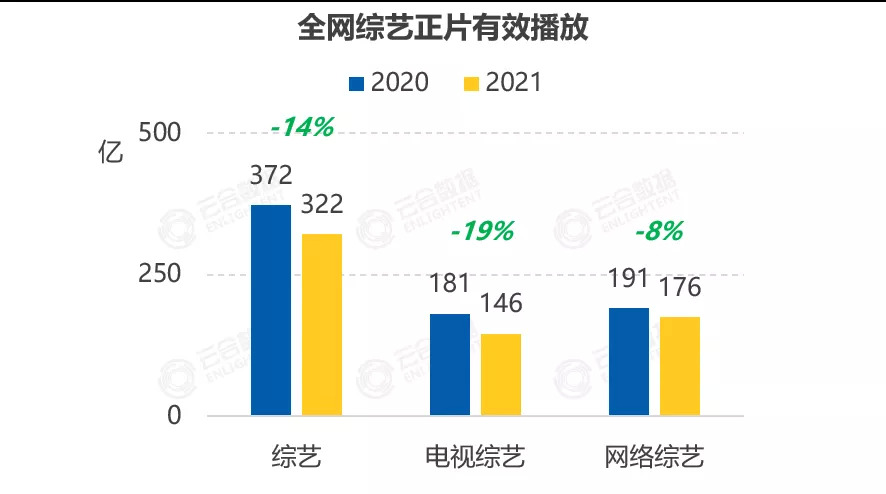 整体来讲,电视综艺与网络综艺、综N代与创新综艺、视频平台抢位赛等大的行业命题,进度条基本平稳推进。云合数据显示,2021年全网综艺累计正片有效播放量322亿,同比下滑14%,但是网络综艺占比却在上涨;其中爱奇艺、腾讯视频在有效播放、上新综艺等多维度领先,优酷、芒果深耕类型赛道。
