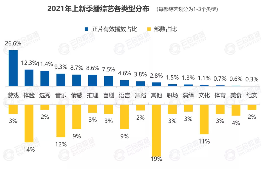 相比全民爆款,2021年的综艺执着于打透圈层,不断垂直深耕更细分的题材类型和受众群体,这也是市场发展的必然。不过相比以3%部数占比撬动26%有效播放的游戏真人秀、以2%部数占比撬动11.4%有效播放的选秀,他们同样要面对的便是市场影响力问题。