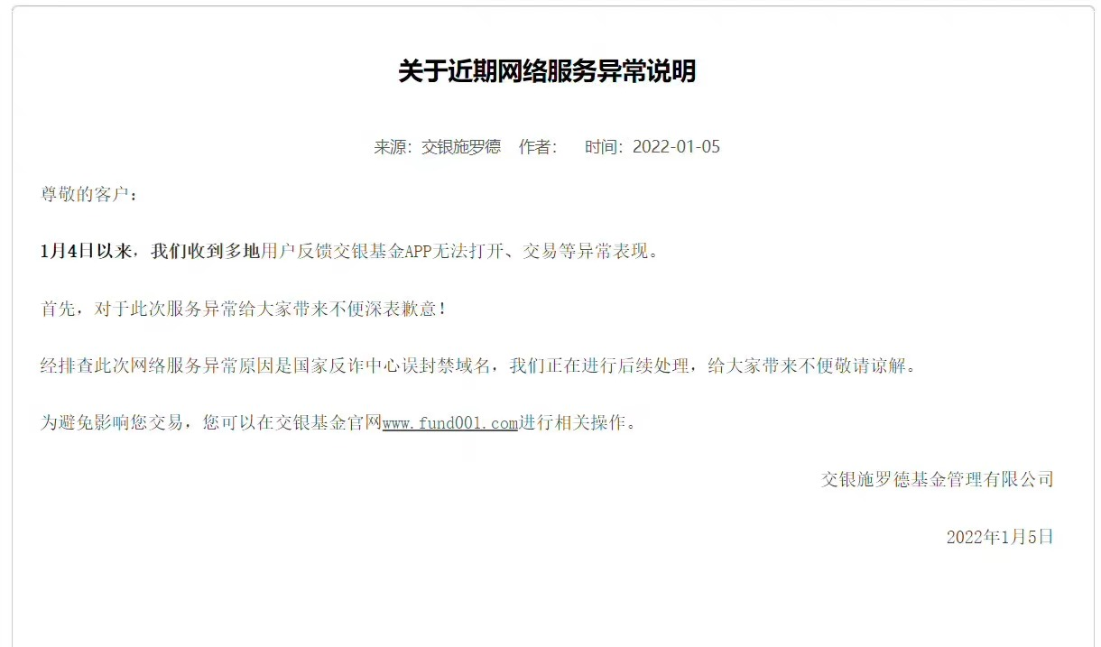 交银施罗德基金在官网公告近期络服务异常的说明,表示近日受到多地用户反馈交银基金APP无法打开、交易等异常表现,经排查此次网络服务异常原因是国家反诈骗中心误封禁域名。