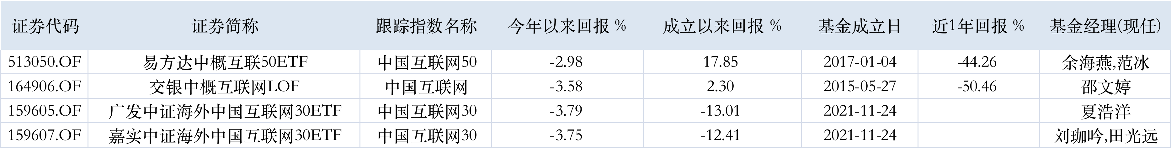 去年以来,受政策监管等影响,互联网公司股价大幅下挫。拼多多(PDD.O)、京东健康(6618.HK)等年内纷纷上演“腰斩”行情。据中证指数官网显示,截至1月6日,中证海外中国互联网50指数近一年以来收益率为-43.33%,中证海外中国互联网30指数为-44.95%,中证海外中国互联网指数则为-52.6%。